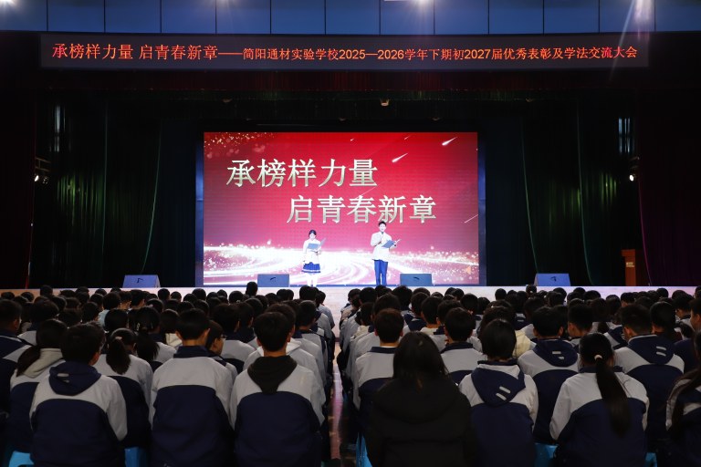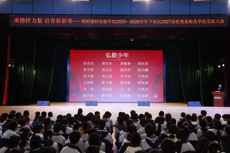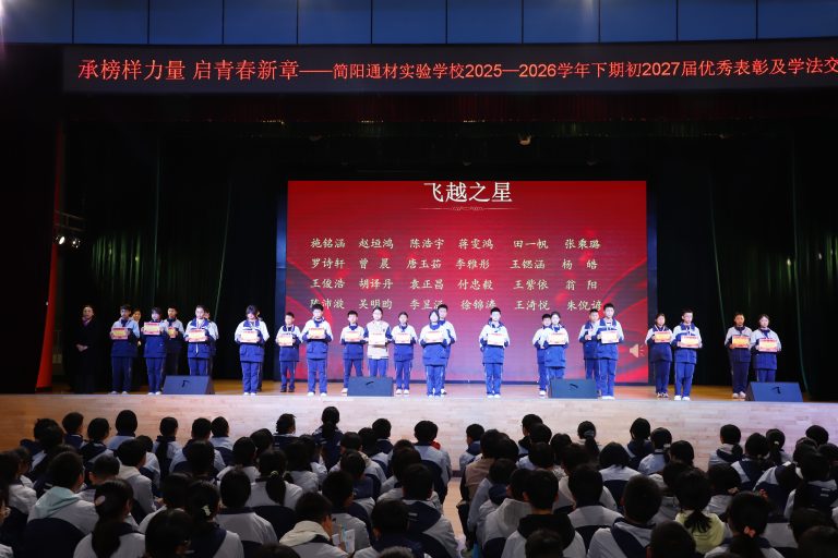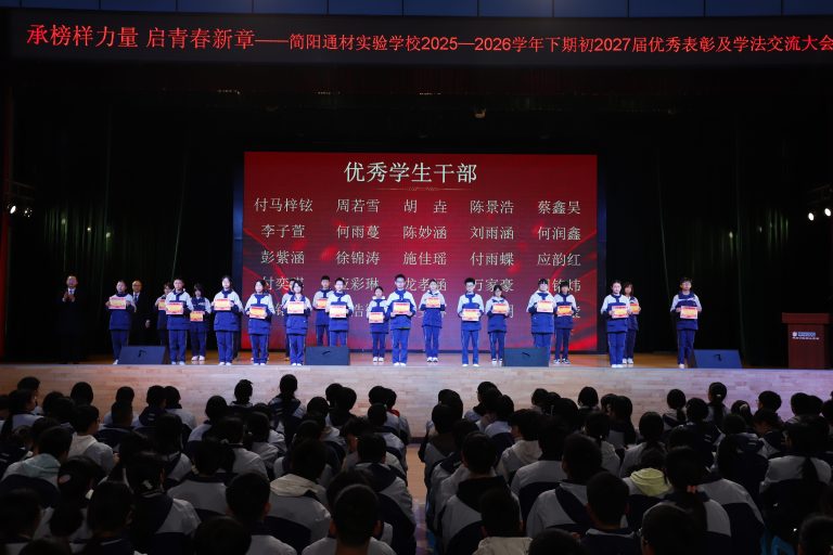 为表彰先进、树立榜样,营造互帮互助、比学赶超的优良学风,激励全体学子以昂扬姿态奋进新征程,3月10日晚,简阳通材实验学校初2027届在艺体馆三楼隆重举行2025—2026学年下期优秀学生表彰及学法交流大会。