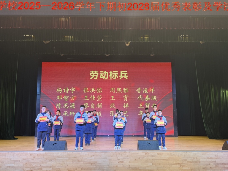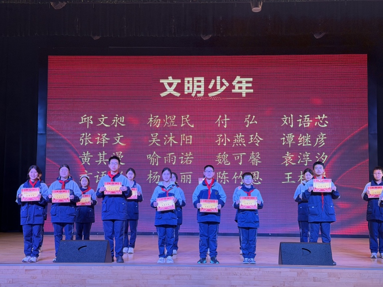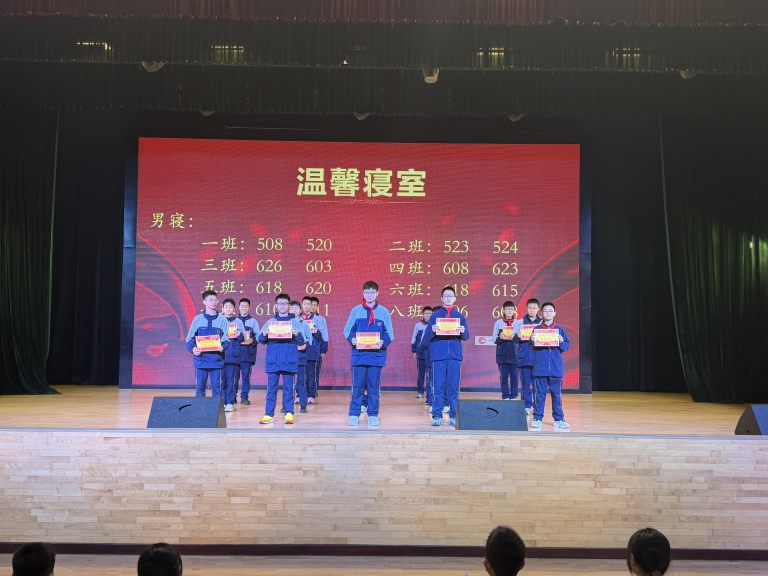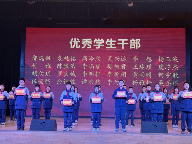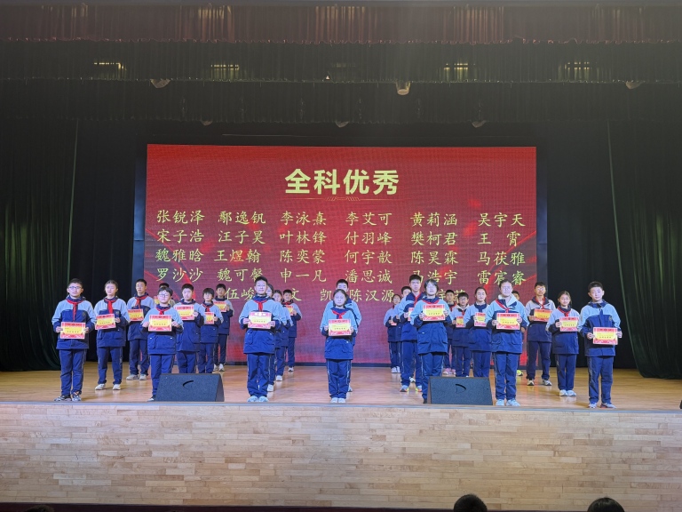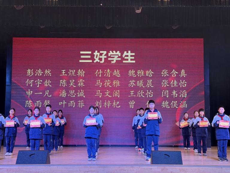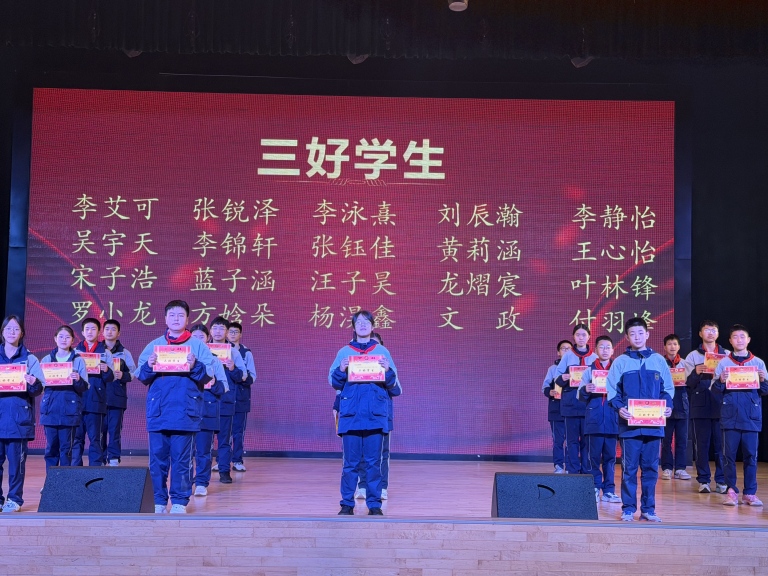 “三好学生”德为根、智为干、体为叶,在春风里站成一道向上的风景;“优秀学生干部”以责任与担当,守护集体的秩序与温度;“文明少年”言行得体、谦逊有礼,用微笑传递温暖,用礼貌彰显素养;“劳动标兵”用最朴素的方式诠释“劳动最光荣,奋斗最幸福”的真谛;“优秀组长”带领组员共同进步,印证了“独行快,众行远”的哲理。尤为引人注目的是“全科优秀”奖的颁发。这群“六边形战士”以全优之姿行至山巅,用自律书写凯歌,他们以实力证明:卓越,从来不是天赋的馈赠,而是方法与汗水的结晶。此外,“温馨寝室”的表彰也让典礼增添了几分温情。窗明几净的寝室,不仅是校园里的温暖小家,更是同窗情谊的最好注脚。文明班集体的颁发将整个颁奖活动的氛围推向了高潮。