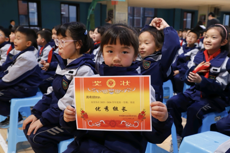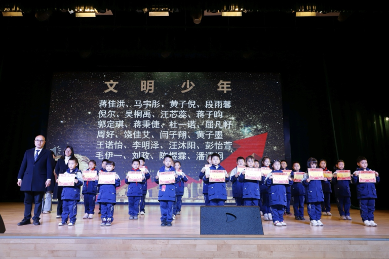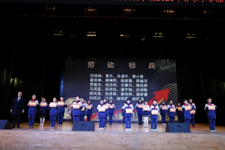 文明少年、劳动标兵相继登台,他们用言行诠释着品德的力量,用汗水书写着劳动的荣光。蒋睿华、周月、蔡娟、徐霞等老师分别宣读获奖名单,学校领导为标兵们颁发奖状。